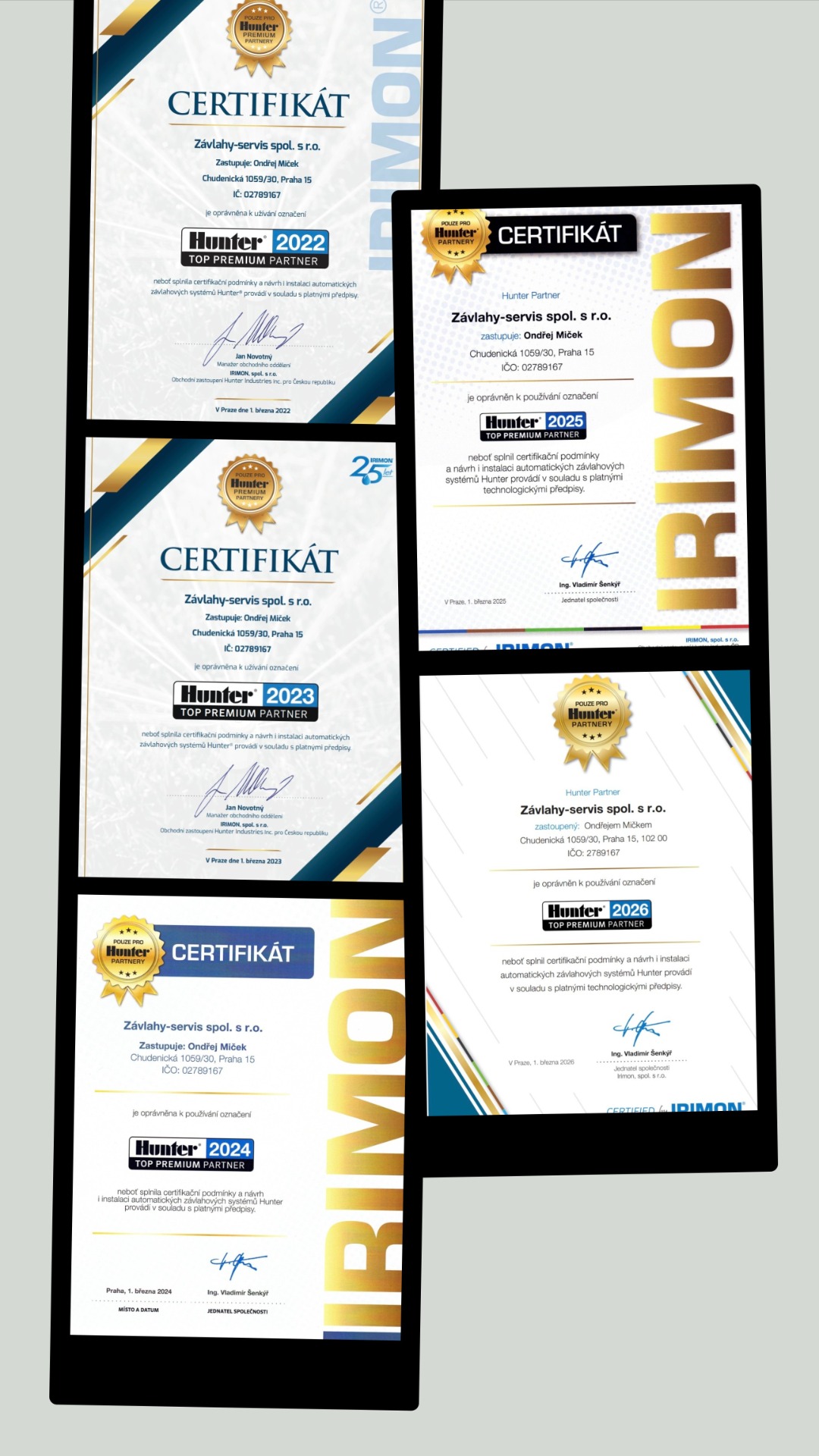 Jsme také hrdí na to, že jsme po mnoho let certifikovaným prémiovým partnerem předního světového poskytovatele zavlažovacích systémů Hunter.